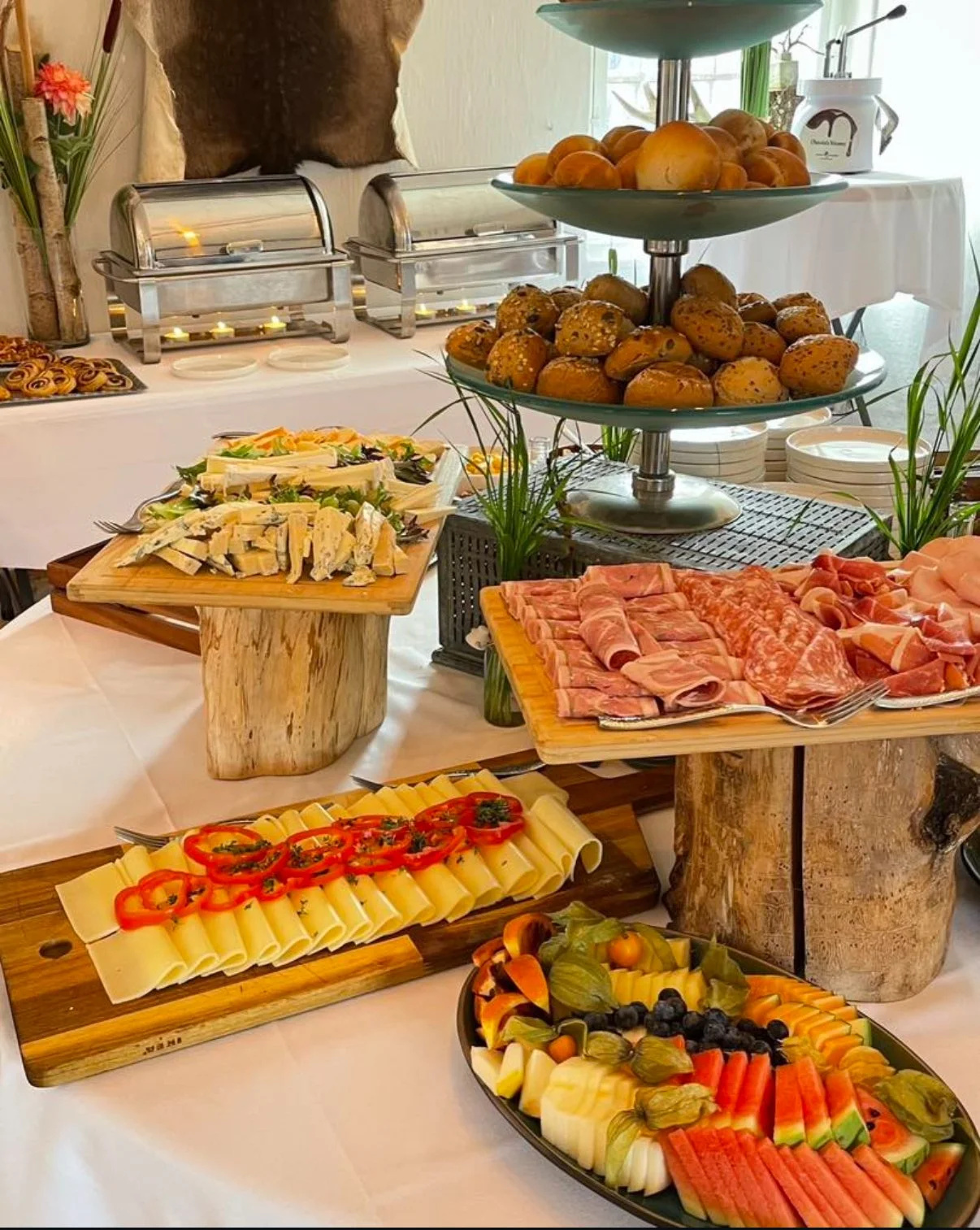 Klassisk brunch, med røræg, bacon, pølser, charcuteri, forskellige oste, sødt, kaffe/the og juice, og meget mere - ja faktisk nærmest alt hvad hjertet begærer - plus som altid et lækkert twist ala Den Gamle Stald.